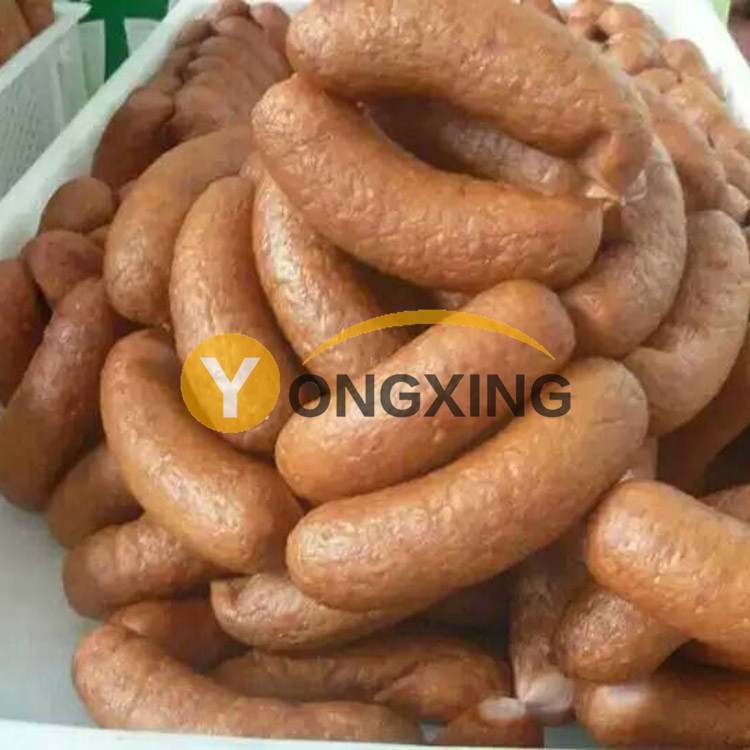 3.灌腸。用灌腸機(jī)將肉餡灌入腸衣內(nèi),灌肉后每隔20厘米左右為一節(jié),節(jié)間用細(xì)繩扎牢